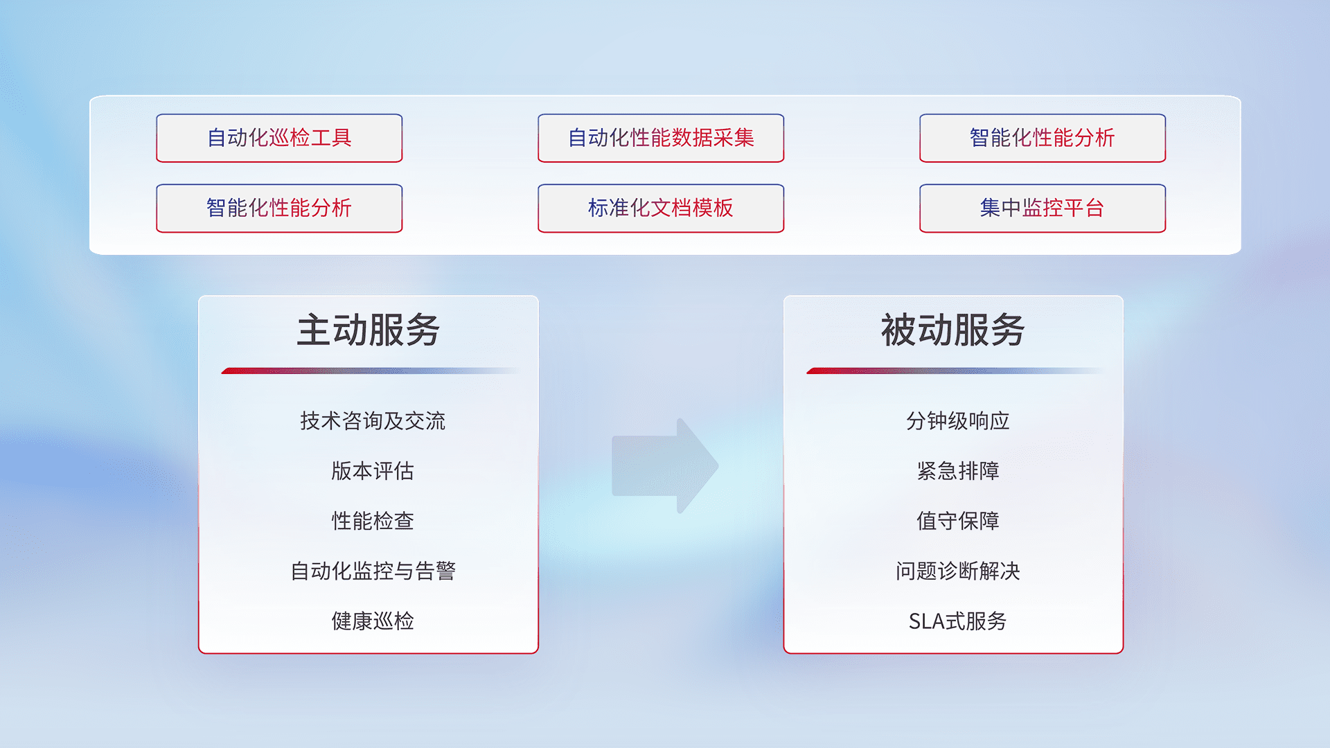 智能化工具和标准化文档,,,,保障服务质量,,提供主动服务(包含技术咨询、、、、版本评估、、、性能检查、、、自动化监控与告警、、健康巡检)和被动服务包含(分钟级响应、、、紧急排障、、值守保障、、、问题诊断解决、、、SLA服务)。。。